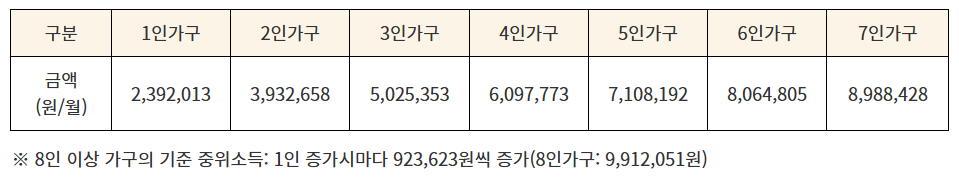 생계지원은 기준중위소득의 100분의 40을 한도로 합니다. 기준 중위소득은 다음과 같습니다.