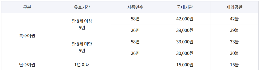 여권 종류 및 면수에 따라 상이 (아래 수수료 안내 참고)
