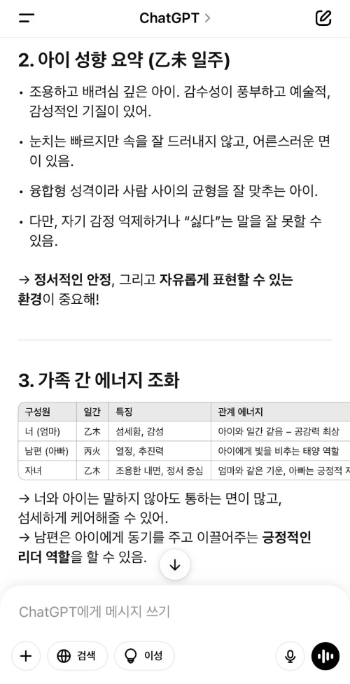 프롬프트 : (부모와 자녀 생년월일, 태어난시 입력) 아이 성향 알려줘~