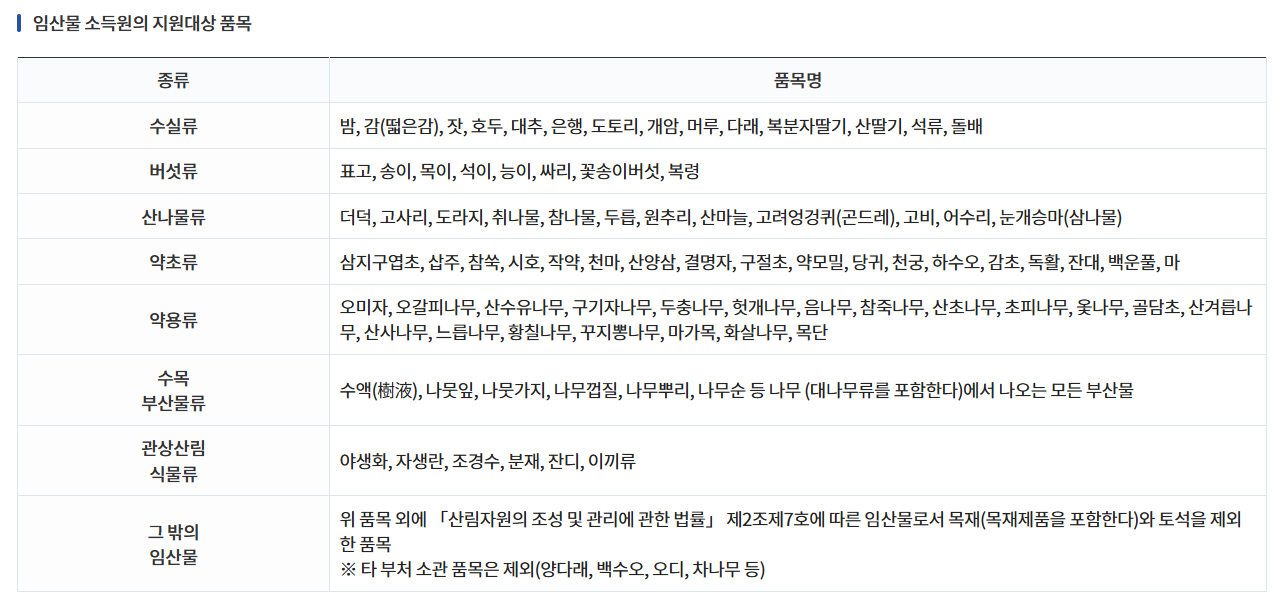 - ①「임업 및 산촌 진흥촉진에 관한 법률」 시행규칙 별표2의 수실류·약초류· 약용류· 수목부산물류· 관상산림식물류 (분재 제외)·그 밖의 임산물 : 1천㎡ 이상