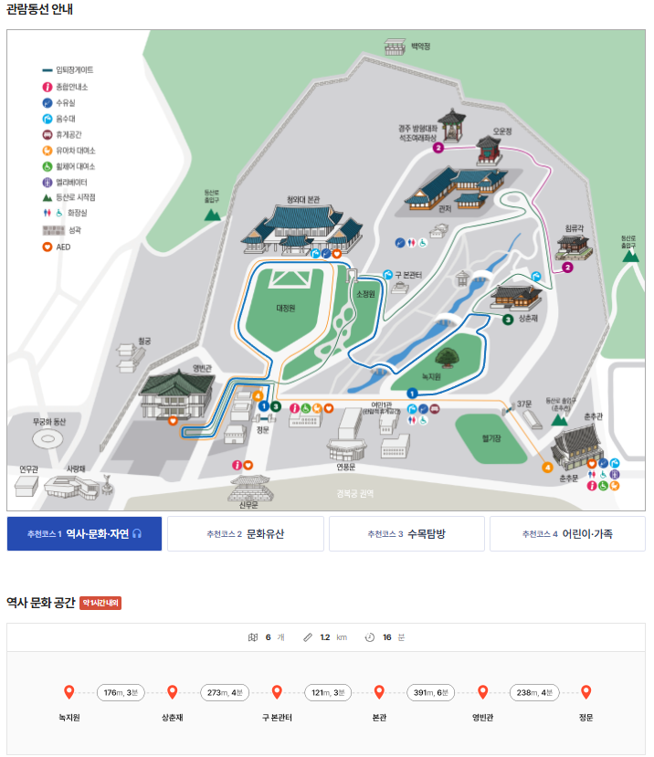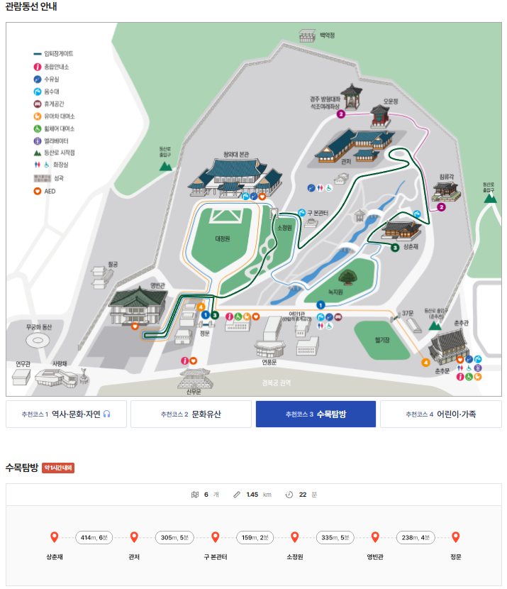 - 해설이 있는 구역에서는 반드시 해설가 안내에 따라 이동해야 하며, 사진 촬영이 제한된 구역도 존재합니다.