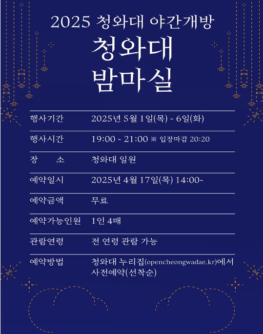 2025년 5월, 청와대 야간개방 특별 행사 ‘청와대 밤마실’이 다시 찾아옵니다.