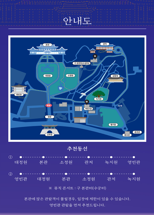추천 관람 동선1: 대정원 → 본관 → 소정원 → 관저 → 녹지원 → 영빈관