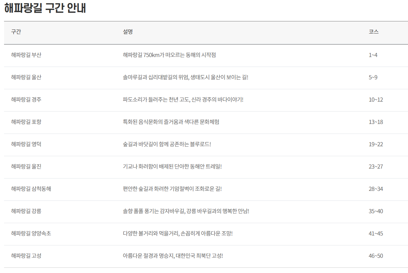 - 특징: 동해안의 푸른 바다와 해안 절경을 감상할 수 있는 코스입니다. 맑은 바다와 함께 걷는 길은 힐링과 여유를 제공합니다.