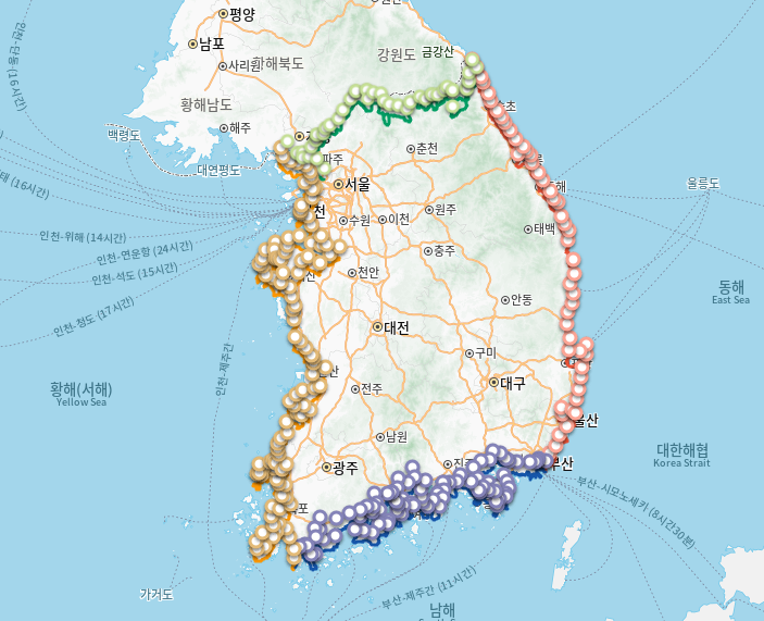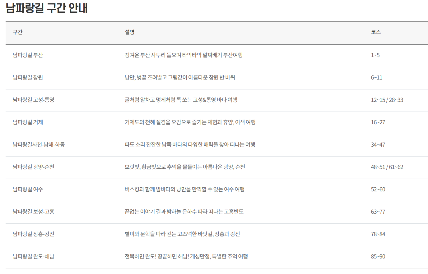 - 특징: 남해안의 다채로운 해안선과 섬들을 연결하는 코스로, 다양한 해양 생태계를 체험할 수 있습니다.