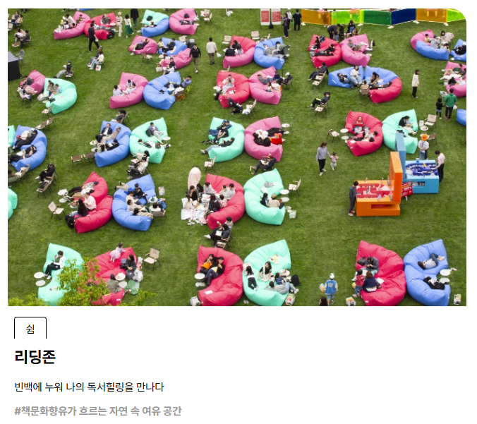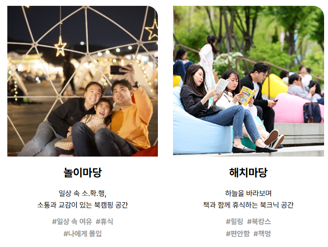 - 자유로운 공간 활용: 빈백, 파라솔, 매트 등 편안한 야외 독서 환경 제공