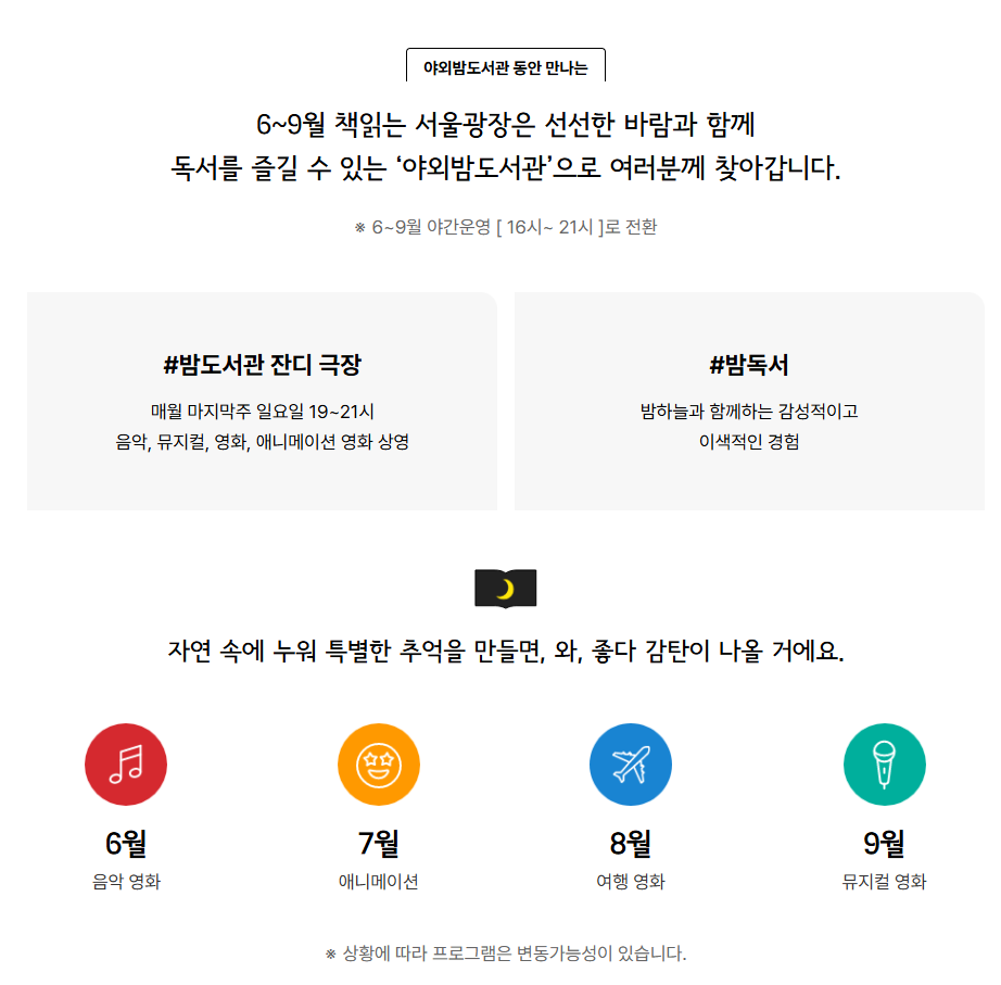 ※ 6월9월 무더위 기간엔 오후 4시9시 야외밤도서관으로 전환 운영